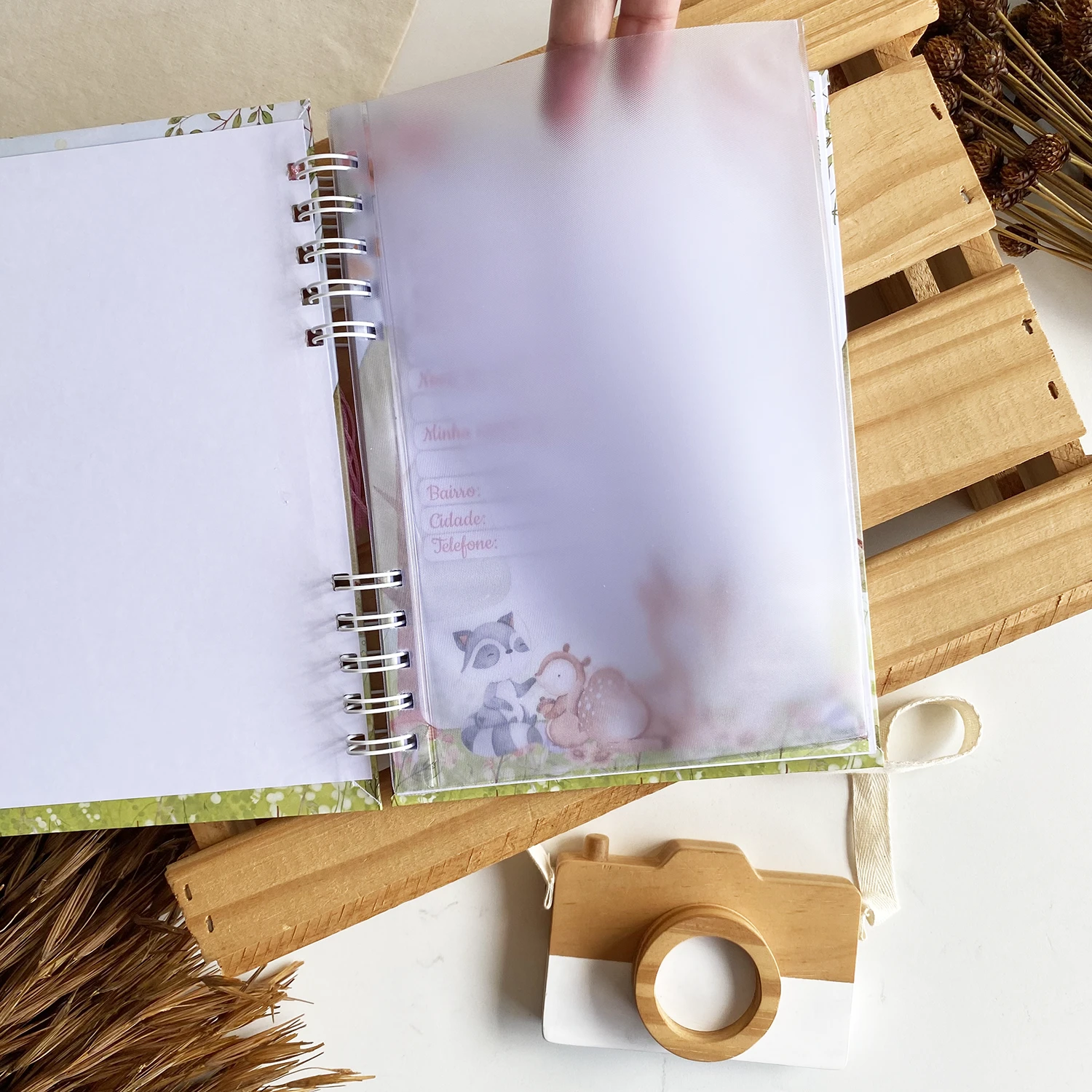 – Folhas grossas (180g) para suportar o peso das fotos e não marcar ao escrever;