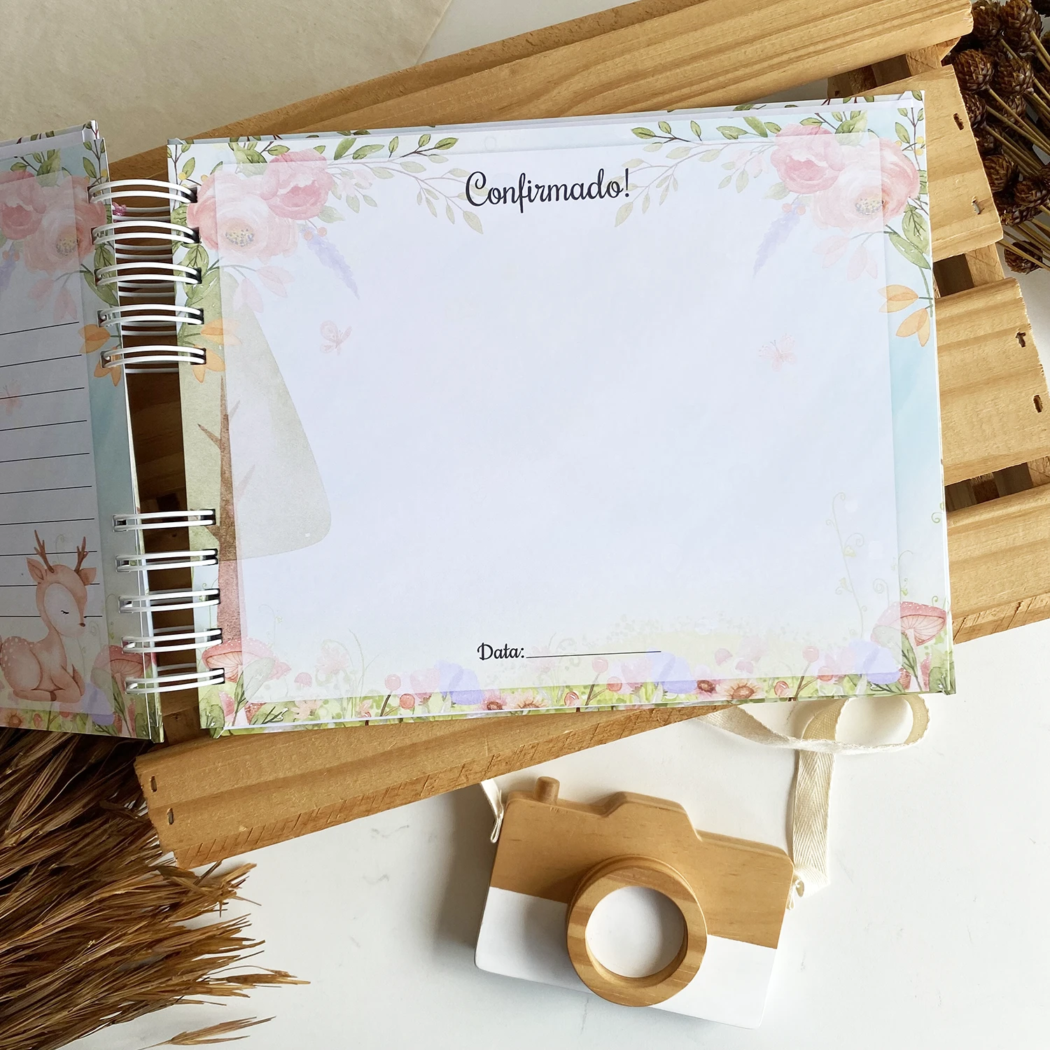 – Tamanho total 15,5 cm de largura x 22 cm de altura. Obs.: O arame aumenta a caderneta em 1,5 cm na largura.