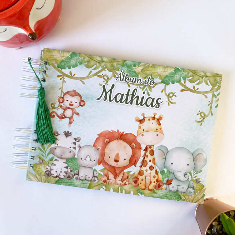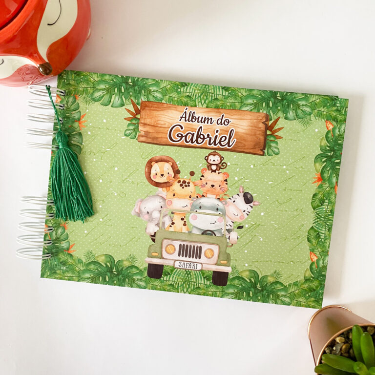 Álbum de Fotos Safári 7 O Álbum de Fotos é ideal para registrar fotos do momento especial que você desejar. Além disso, o texto na capa pode ser de sua escolha.